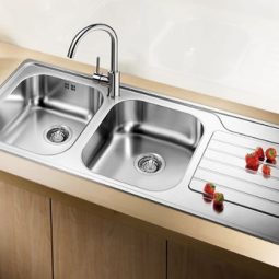 + Chậu rửa bát Blanco dinas làm bằng thép không rỉ phù hợp với hầu hết các tủ bếp