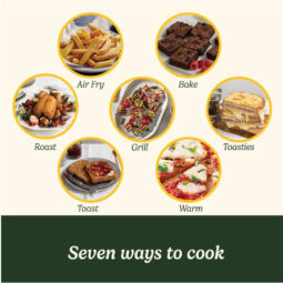 – Chọn chế độ nấu: có 7 chế độ khác nhau bao gồm: chiên không dầu, giữ ấm, nướng thịt cá, nướng thịt cá đối lưu, nướng bánh đối lưu, nướng bánh, nướng bánh mỳ sandwich.