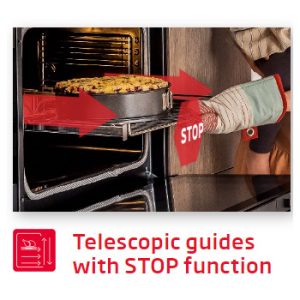 Thanh ray trượt giảm chấnKhi đẩy khay có thức ăn nóng ra, bạn sẽ dễ bị bỏng và có nguy cơ làm rơi khay. Không phải với lò nướng Fagor 8H – 175AX A! Tất cả là nhờ vào các thanh dẫn, được trang bị các va chạm đặc biệt để ngăn chặn việc chèn và mở rộng. Nhờ có chúng, bạn có thể hoàn toàn an toàn mà không có nguy cơ bị bỏng, lắp và đẩy ngay cả khay nóng và chịu tải nặng. |