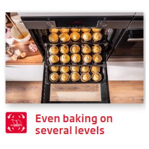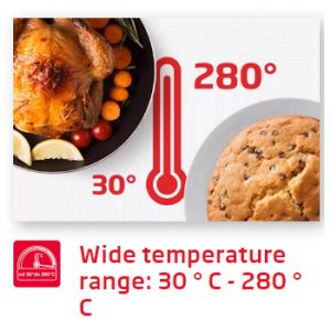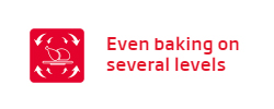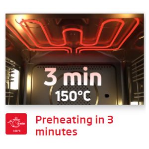 | Làm nóng nhanh lên tới 150ºC chỉ trong vòng 3 phút | Dải nhiệt độ lớn lên đến 280ºC cho nhiều món ăn | Mặt kính bên ngoài chỉ 35ºC khi nhiệt độ bên trong là 180ºC | Nhiệt phân phối chuẩn xách toàn bộ lò đảm bảo tất các các tầng đều chín đều | |||