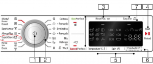 AllergyPlus / Hygiene , Drain , Drum clean with reminder , Duvet , Easy iron , EcoPerfect , higher water level , Night Wash , ON , Prewash, quick wash/mixture , rapid 15 min , Ready , rinsing/spinning , shirts , SpeedPerfect , Spin speed reduction , sports , stain selection , start/pause , Temperature selection |