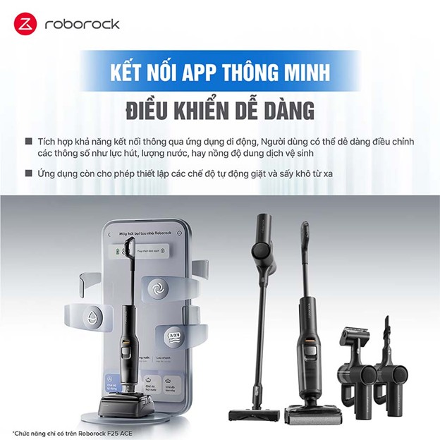 Roborock F25 ACE tích hợp tính năng kết nối thông minh qua ứng dụng di động, cho phép người dùng điều khiển và giám sát máy hút bụi từ xa. Bạn có thể dễ dàng cài đặt lịch trình vệ sinh, kiểm tra tình trạng máy hoặc nhận thông báo khi có vấn đề, mang lại sự tiện lợi và kiểm soát tối đa trong việc quản lý công việc vệ sinh tại nhà.