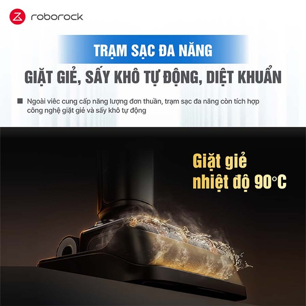 Một tính năng đáng chú ý khác của Roborock F25 ACE là khả năng tự làm sạch và sấy khô với nhiệt độ cao. Sau khi sử dụng, con lăn sẽ được tự động làm sạch và sấy khô, giúp giảm thiểu vi khuẩn và mùi hôi, đồng thời bảo vệ máy khỏi sự tích tụ của bụi bẩn và vi khuẩn. Điều này giúp duy trì hiệu suất làm sạch lâu dài và tiện lợi hơn cho người dùng.