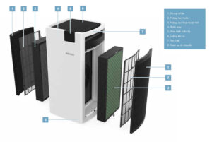 - 6 tháng – 1 năm thay bộ lọc Hepa + than hoạt tính theo mức độ ô nhiễm/ bụi bám vào màng lọc trong máy (máy tự động thông báo)