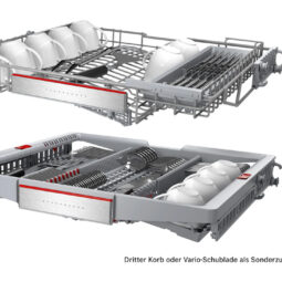 Khay đựng VarioDrawer ProKhay thìa dĩa trên cùng VarioDrawer Pro của máy rửa bát Bosch SMS4HBW00D được thiết kế lại tối ưu hóa diện tích sử dụng, cung cấp thêm không gian cho những vật ti lớn như dao kéo, muỗng hoặc các vật nhỏ như cốc uống cafe. Các thành phần điều chỉnh được làm màu đỏ để người sử dụng dễ nhận biết |