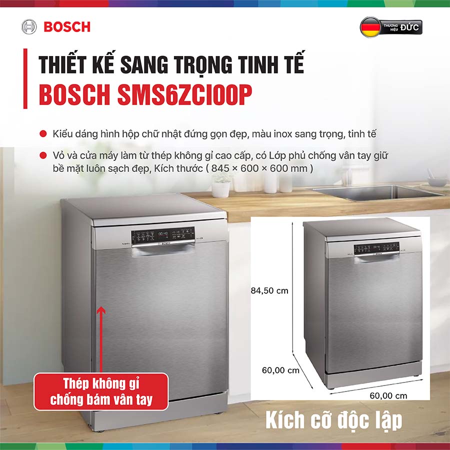 Máy rửa bát Bosch SMS6ZCI00P được nhập khẩu nguyên chiếc từ Đức, thiết kế đứng độc lập với công suất rửa 14 bộ chén bát Châu Âu với chất liệu thép không gỉ cao cấp sử dụng bền bỉ đem lại sự tiện lợi cho mọi gia đình.