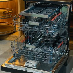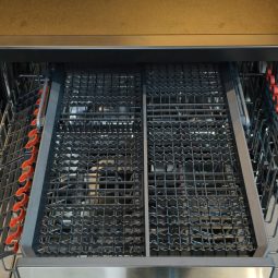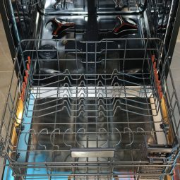 Bên trong khoang máy được bố trí thông minh với 3 khay chứa cơ động, cho phép người dùng tùy chỉnh linh hoạt theo số lượng bát đĩa cần rửa. Đặc biệt, máy được trang bị ngăn giỏ đựng dao kéo/đũa riêng biệt, giúp các vật dụng nhỏ được làm sạch tối ưu mà không lo bị lẫn lộn hay thất lạc.